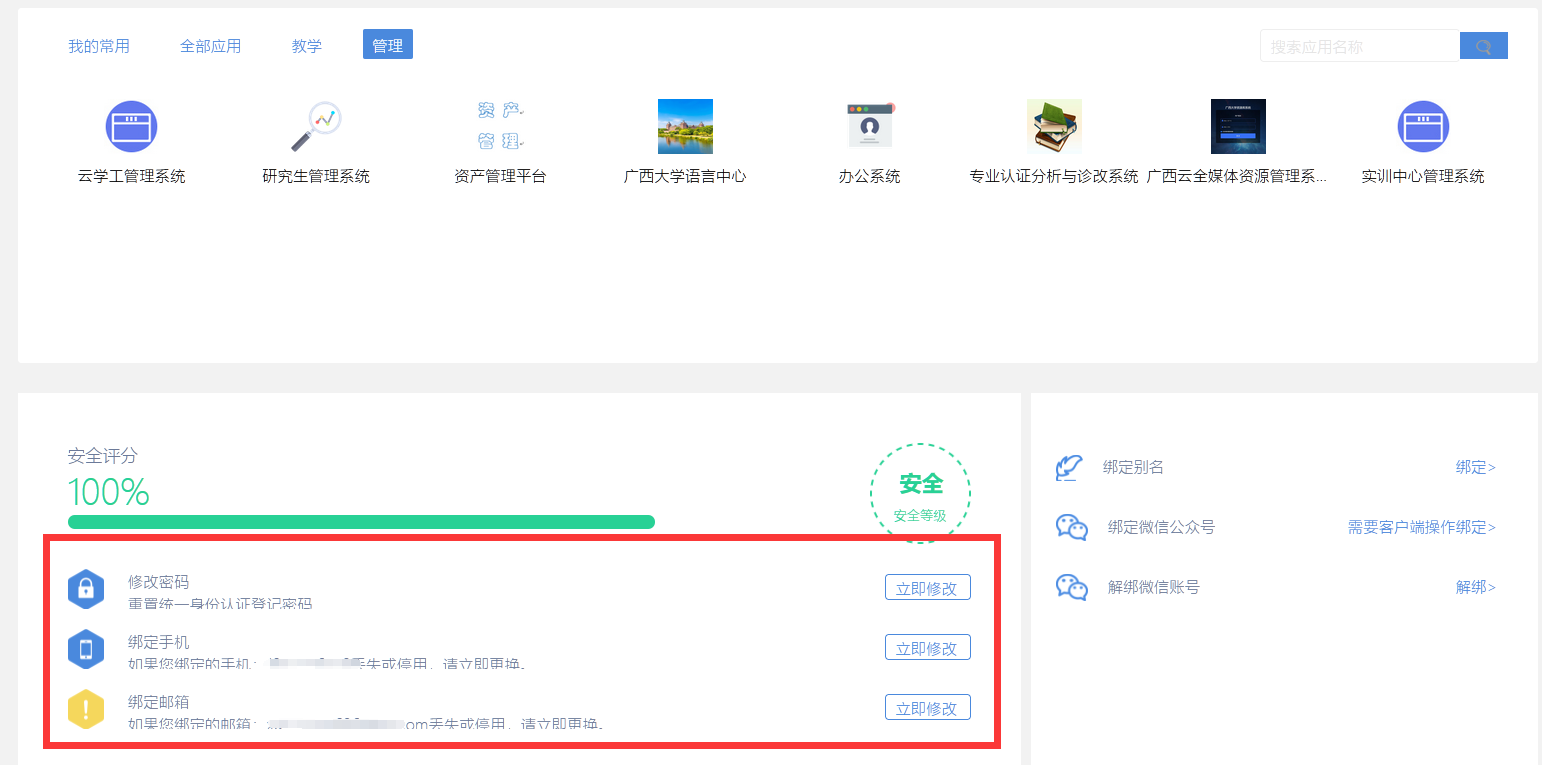温馨提醒:请用户绑定手机、微信,设置密码为带有“字母+数字+字符”的组合,以便更好使用统一身份认证功能。原本已经设置好的用户可直接使用,不需重复操作。