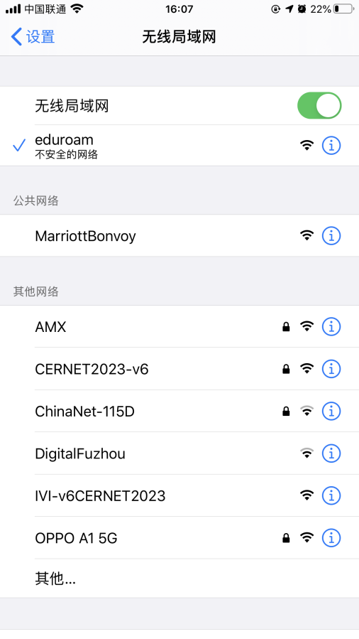 在校外的Eduroam联盟机构,连接eduroam WiFi。