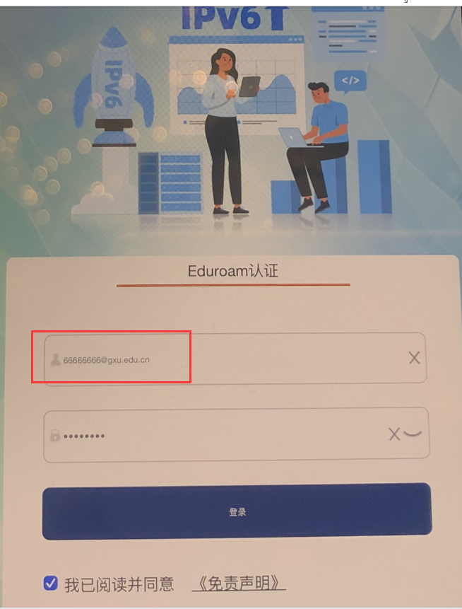 1. 连接太阳集团2138开放的eduroam WiFi,在弹出的登录页面中输入本人统一身份认证账号+@联盟高校域名、对应的密码登录。