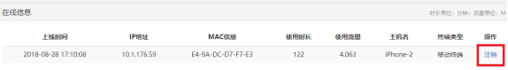 III、登录自服务系统,在首页中找到在线信息后,点击要下线终端后面的“注销”(如图2所示)。