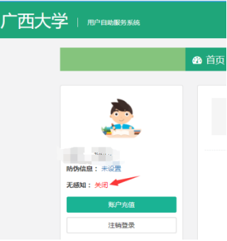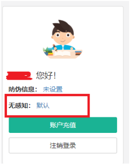 系统默认是开通无感知登录功能的(即在自服务的首页中“无感知”旁边为“默认”,如图6所示)。如不希望使用无感知登录功能,可点击“默认”按钮切换到“关闭”状态,即可关闭本人账号的无感知登录功能,如图7所示。