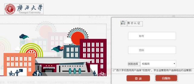 (1)上网终端连上校园网的有线或无线网络后,输入任意一个外网网址(如http://www.163.com ,苹果终端请使用http://login.gxu.edu.cn),系统会自动弹出上网登录界面(如图1所示),输入账号和密码、线路选择默认的“校园网”,点击登录即可通过校园网宽带上网。用户还可以通过客户端方式进行登录,请点击上网登录界面下方中的“客户端下载”下载对应终端的上网客户端。(注:网页登录方式不能收藏认证界面进行登录上网,也不能直接输入认证服务器的IP地址进行登录,只能是在输入外网地址后,系统自动弹出的认证界面进行登录上网。)