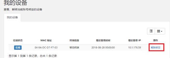 如需在已无感知登录的上网终端上更换另一个账号登录,或需切换校园网宽带和运营商宽带时,可在自服务系统首页中“服务”—>“我的设备”中点击“进入”,查看是否有当前账号所绑定的上网设备(如图8,9所示),如果有,则点击“解除绑定”。然后返回自服务首页,在“在线信息中”找到此已登录的上网终端(如图10所示),点击后面“注销”让此上网终端下线,然后在上网登录页面中输入其他账号、密码、选其他线路进行登录即可。