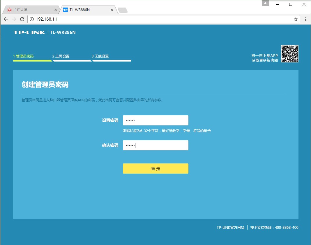 2. 打开浏览器,在地址栏内输入路由器地址192.168.1.1回车。在设置好路由器的登录密码后,确定。