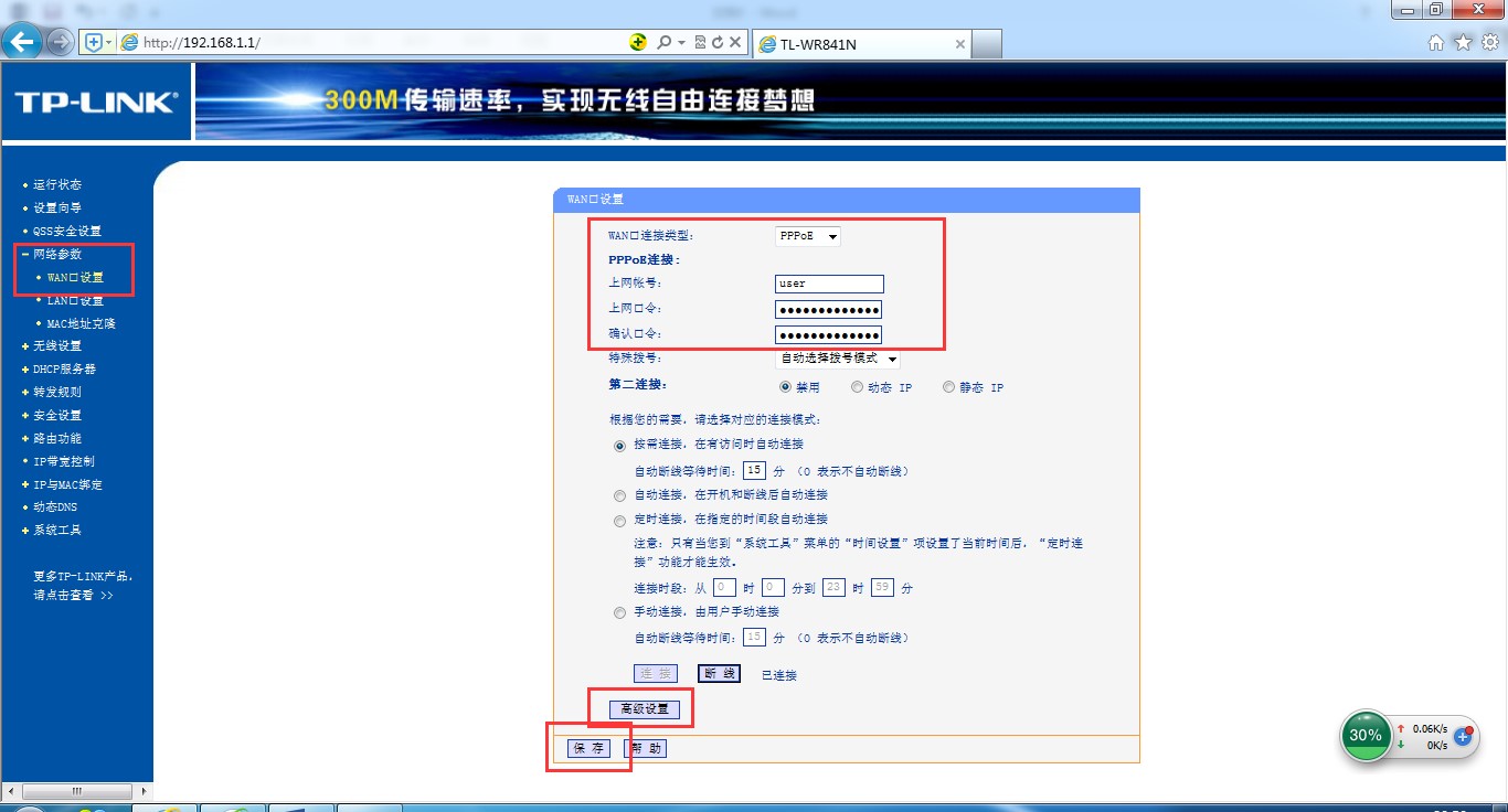 口令(与dr.com客户端一致),点击“保存”按钮,再点击“高级设置”。