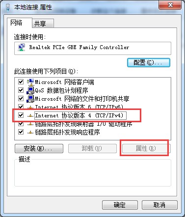 在本地连接属性窗口中,点击“Internet协议版本4”,点击“属性”按钮