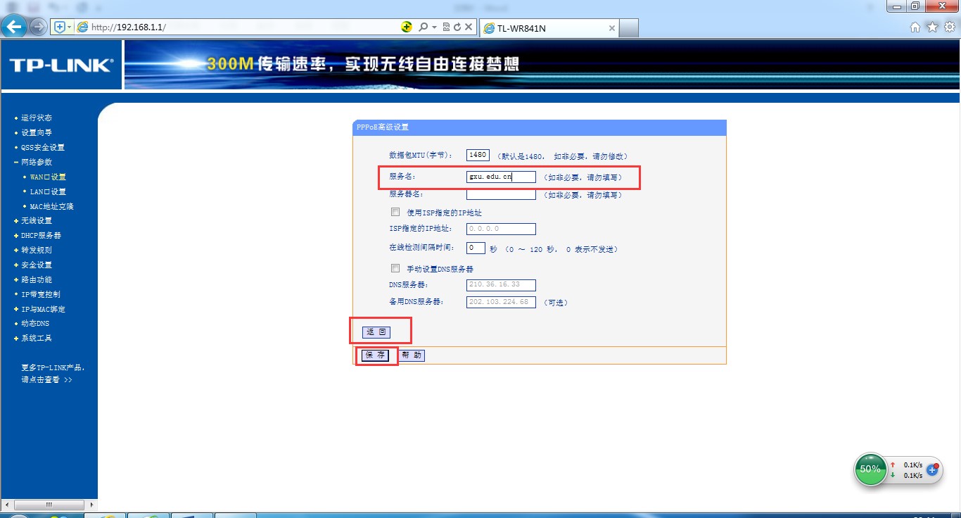 在“高级设置”界面中,输入太阳集团2138拨号服务名“gxu.edu.cn”,点击“保存”按钮完成网络设置。