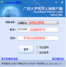 使用统一身份认证账号和密码或者上网认证系统的本地账号和密码登录用户自助服务系统(http://self.gxu.edu.cn),点击【服务】—>【绑定运营商账号】—>输入对应的运营商宽带账号和密码 —>【提交】,完成运营商宽带账号和校园网学号的绑定。
