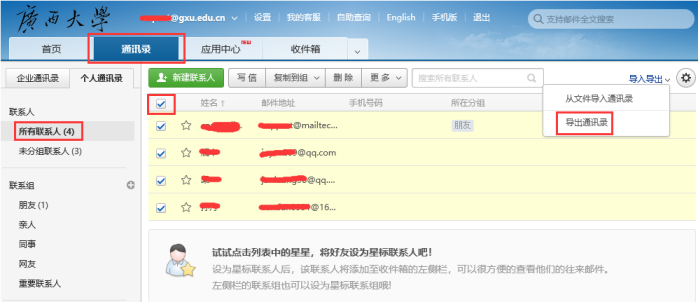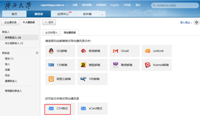 1. 登录被搬迁的邮箱,导出通讯录,如图六所示。