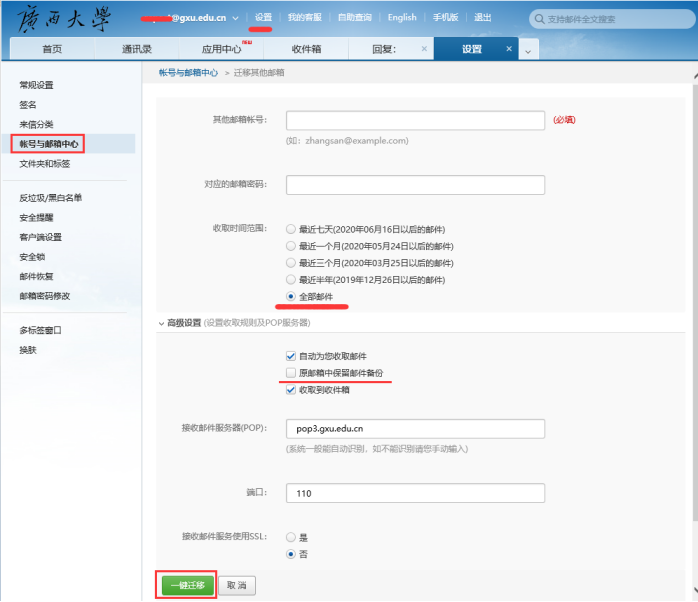 其他邮箱账号:输入被迁移的完整的邮箱地址,例如输入地址bbb@gxu.edu.cn,