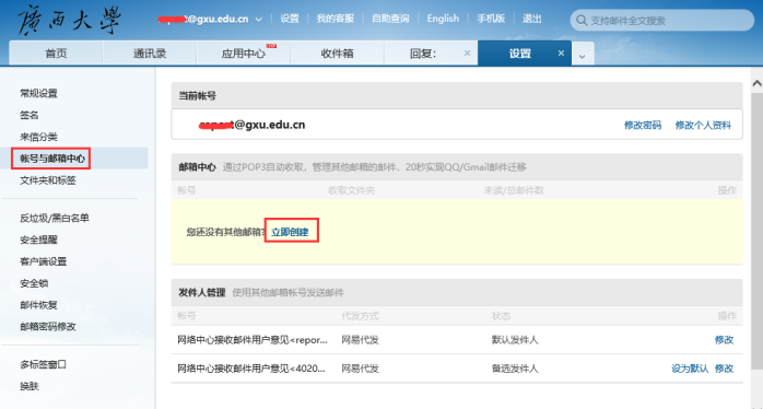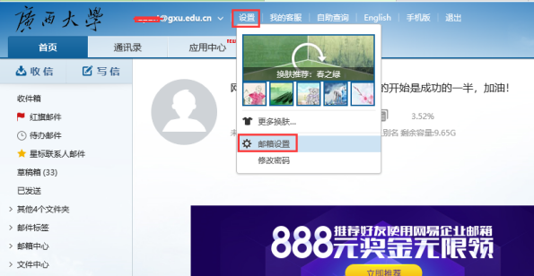 1. 登录您要保留的邮箱账号:登录教工邮箱http://mail.gxu.edu.cn/后,点击邮箱首页顶部栏的“设置”,选择“邮箱设置”,如图一所示;