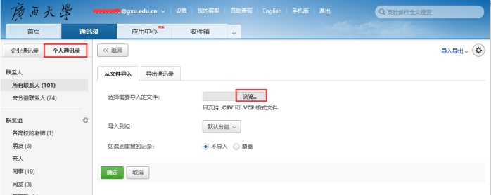 5. 选择上面导出的通讯录文件address.csv,如图十所示。