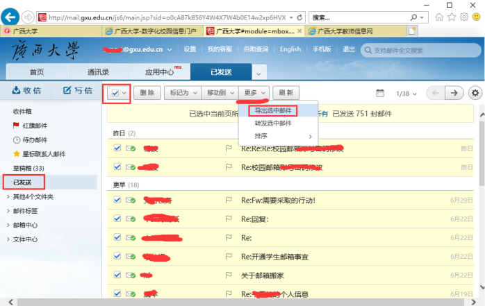 1. 登录要搬迁的邮箱账号,选中需要保留的已发送邮件中的邮件,然后在“更多”的下拉菜单中选中“导出选中邮件”,如图四所示。
