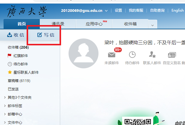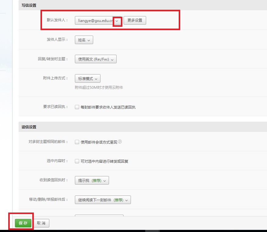 4)在弹出的页面中往下拉,直到找到“写信设置”,在默认发件人旁边的下拉箭头中,选择默认的发件人的名称,然后点击“保存”即可