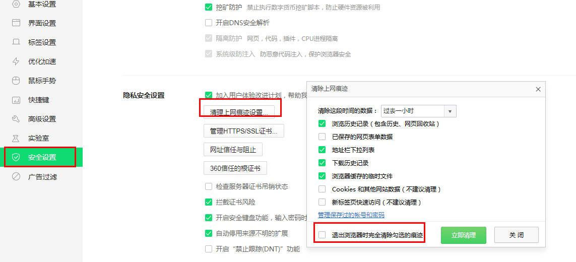 点击【安全设置】,选择【清理网上痕迹设置】,弹出【清理上网痕迹】界面,若是勾选【退出浏览器时完全清除勾选痕迹】,浏览器会自动清除网易企业邮箱60天免验证记录,请去掉勾选确认重启浏览器,再登录操作重试。