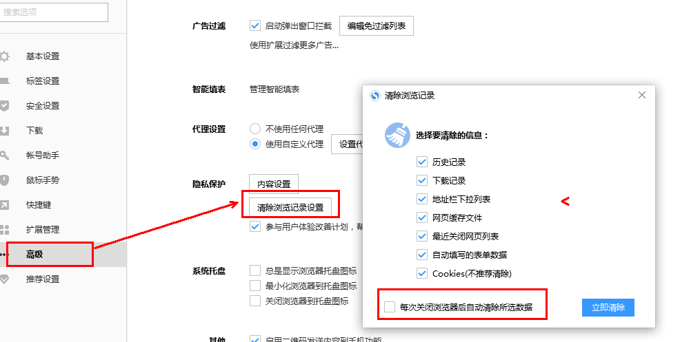 点击【高级】,选择【清除浏览器记录设置】,进入清除浏览器记录界面,若勾选【每次关闭浏览器后自动清除所选数据】,浏览器会自动清除网易企业邮箱60天免验证记录,请去掉勾选确认重启,再登录操作重试。