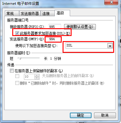 第三步:弹出对话框,选择高级,勾选ssl加密方式,发送服务器选994,然后点击【确认】