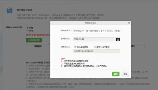 4、如您同时使用多个客户端,为进一步保障安全,请为每个客户端配置独一无二、且均不与邮箱密码相同的授权密码。(系统支持生成最多不超过20个授权密码)