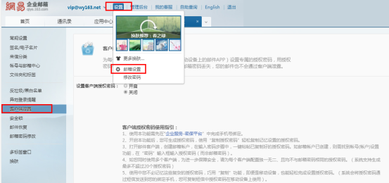 登录校园邮箱用户界面,点击【设置】选择【邮箱设置】选择【客户端设置】,设置客户端授权密码点击【开启】或【关闭】