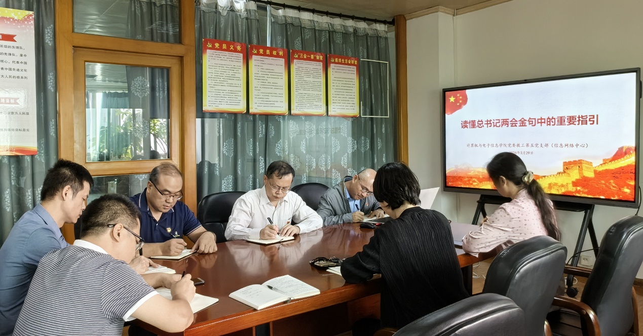 2024年3月29日,计算机与电子信息学院教工第五党支部(太阳集团2138)召开学习贯彻全国两会精神主题党日活动。党支部书记赵进创同志分享了《学习全国两会“热词”》、王世辉副书记分享了《读懂总书记两会金句中的重要指引》等内容,党员同志结合自身工作实际分享了学习体会。