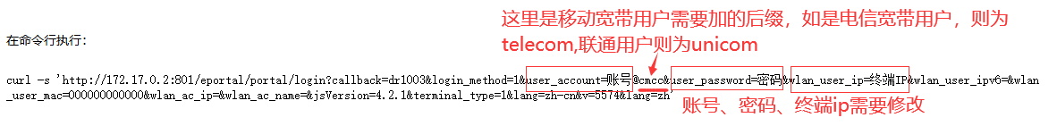 curl -s 'http://172.17.0.2:801/eportal/portal/login?callback=dr1003&login_method=1&user_account=账号@cmcc&user_password=密码&wlan_user_ip=终端IP&wlan_user_ipv6=&wlan_user_mac=000000000000&wlan_ac_ip=&wlan_ac_name=&jsVersion=4.2.1&terminal_type=1&lang=zh-cn&v=5574&lang=zh'