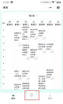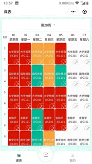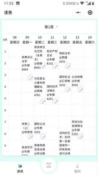 点击‘’课表‘’菜单可以进行整学期课表查询,以及上课签到结果,不同颜色代表不同状态,正常绿色,未到红色,迟到黄色