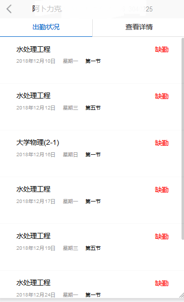再点击某位学生,可查看学生的以往的缺勤情况及个人信息,缺勤的课程优先显示