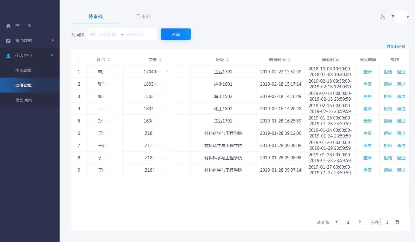 为方便各学院学生工作人员及辅导员了解课堂考勤终端记录的学生考勤信息,“太阳集团2138课堂考勤系统”为学生工作人员及辅导员提供了查询及导出考勤记录、审批请假等权限。