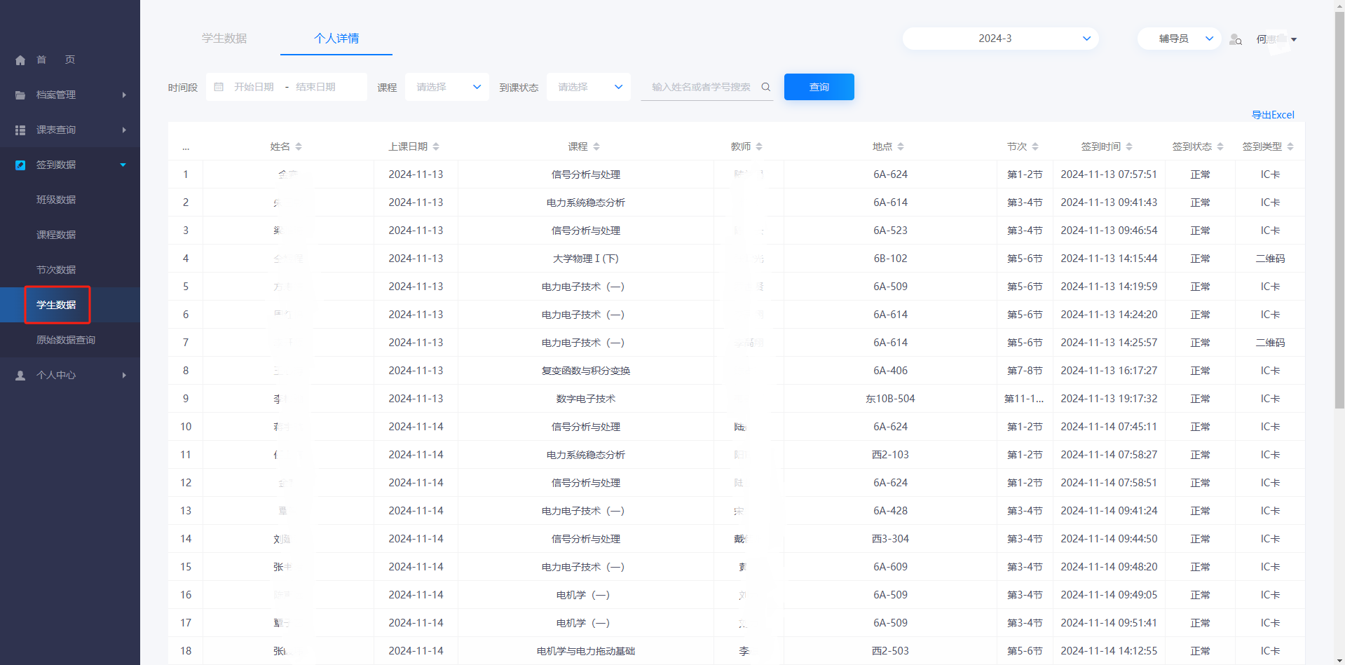 首页展示辅导员所有管理班级的签到情况,汇总统计。也可针对某个学生查看缺勤的签到情况及学生的个人信息。