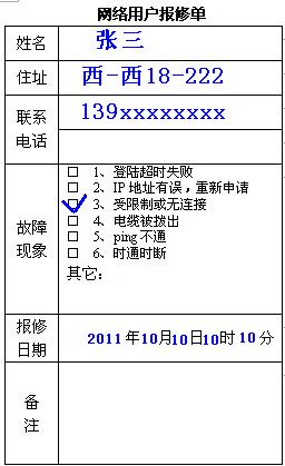报修单填写的内容有:用户姓名、住址(校园-宿舍区楼号-房间号)、联系电话(最好手机)、网络故障现象、报修时间,参见下面样表。