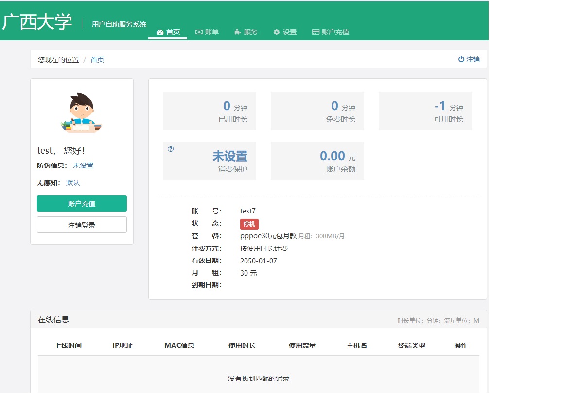 B-2 用户可以查看用户资料、登录记录、交费记录等,包括客户名称、联系电话、证件号码、地址、计费组、MAC地址、余额等信息;