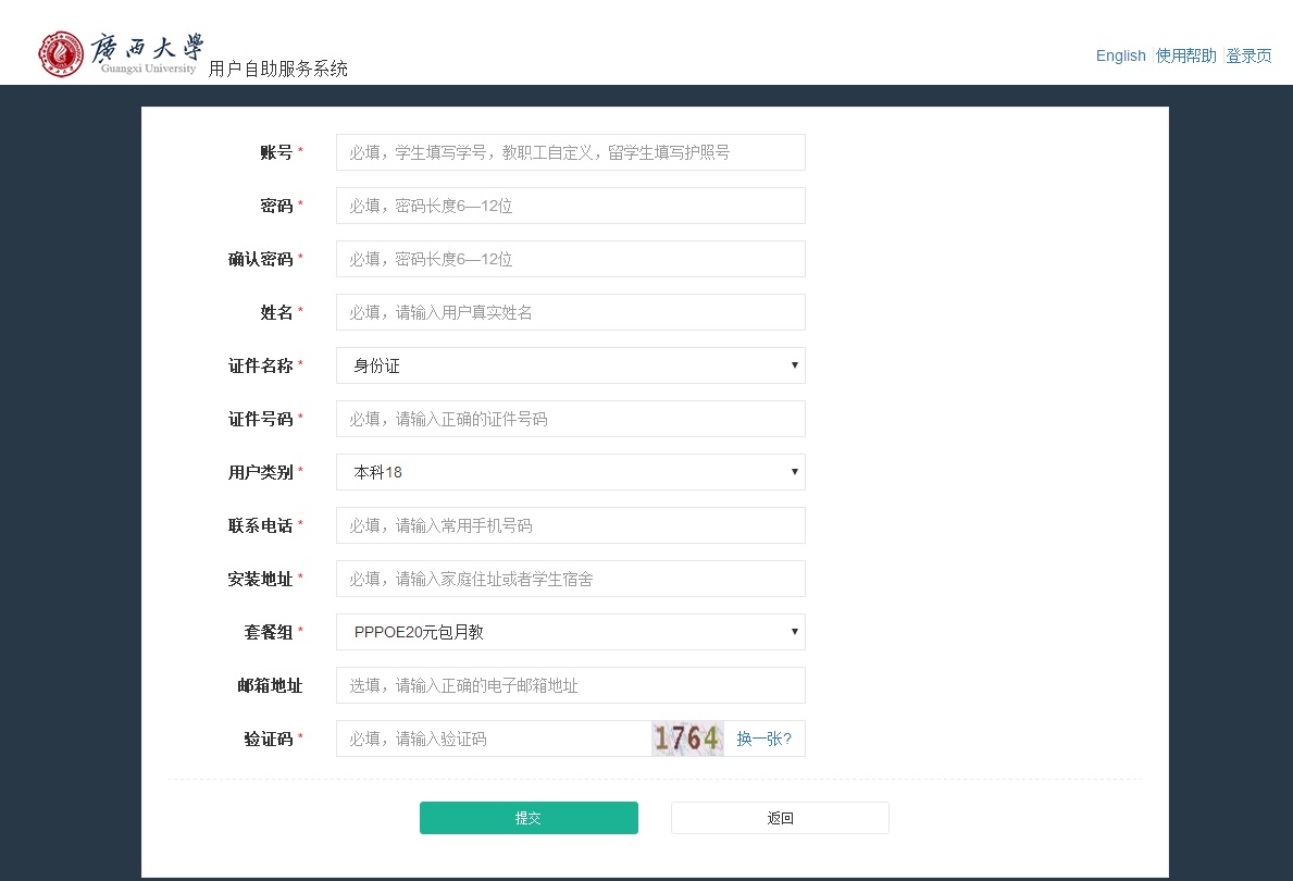 用户自助业务办理系统网址为http://self.gxu.edu.cn,用户在校园内所有可以接入校园网的计算机上均可进入,用户自助业务办理系统为用户提供新用户的预注册、用户信息查询、用户密码更改和密码找回服务。